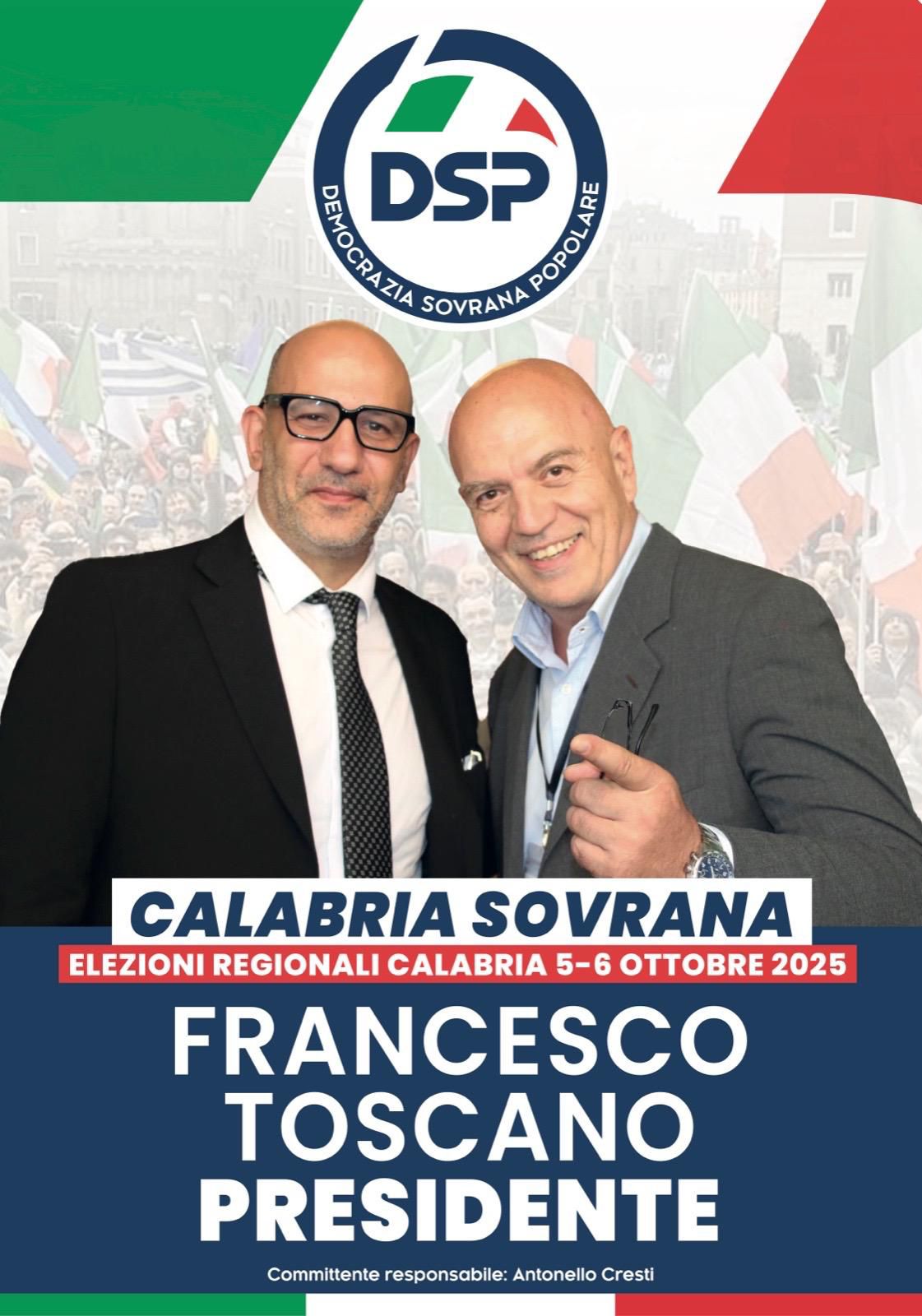 Sono tanti i temi importanti affrontati da Francesco Toscano, candidato DSP (Democrazia Sovrana Popolare), alla Presidenza per le prossime elezioni regionali in Calabria, che si terranno il 5 e 6 ottobre 2025.