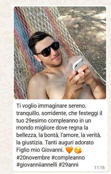 "Ti voglio immaginare sereno, tranquillo, sorridente, che festeggi il tuo 29esimo compleanno in un mondo migliore dove regna la bellezza, la bontà, l’amore, la verità, la giustizia. Tanti auguri adorato Figlio mio Giovanni" - così ha voluto ricordare Giovanni, papà Carlo Iannelli, il 23 Novembre, data in cui ricorre il compleanno del figlio : avrebbe compiuto 29 anni.