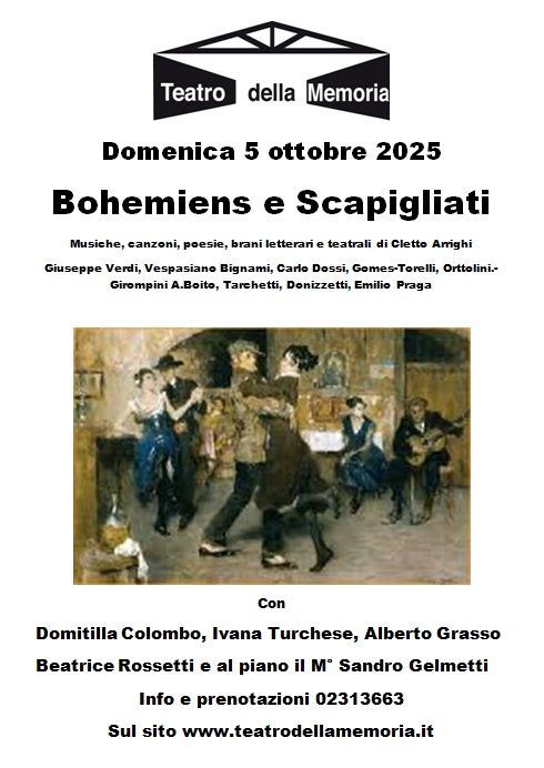 Il Teatro della Memoria apre il 5 di ottobre con uno spettacolo dedicato alla cultura milanese " Bohémiens et Scapigliati", uno spettacolo allestito e messo in scena dalla Compagnia storica del Teatro della memoria, in cui verranno presentati brani musicali, canzoni , poesie e stralci di brani narrativi, con scenette e monologhi teatrali della Scapigliatura milanese, che concorrono così a disegnare un affresco della Milano post-unitaria che comprende un arco di quasi 4 decenni per spegnersi sotto i colpi di cannone di Bava Beccaris.