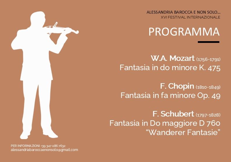 Tre capolavori emblematici ne saranno protagonisti: la Fantasia in do minore K. 475 di W.A.Mozart, la Fantasia in fa minore Op. 49 di F.Chopine la monumentale “Wanderer-Fantasie” D 760 di F. Schubert.