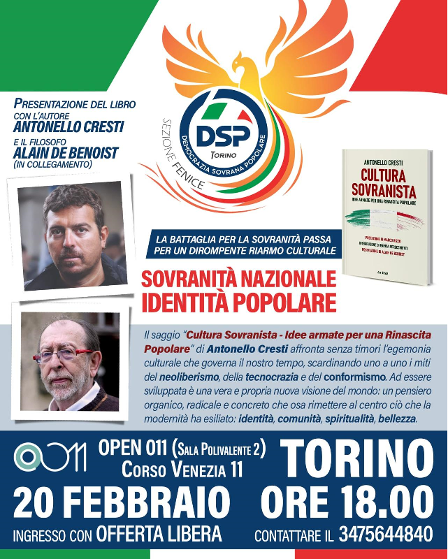 Evento da non perdere, quello che si terrà a Torino, Venerdì 20 febbraio 2026, presso la sala Polivalente 2, in Corso Venezia n. 11 - alle ore 18:00, con Antonello Cresti Autore del libro "Cultura Sovranista - Idee armate per una Rinascita Popolare", che insieme alloscrittore, filosofo e giornalista francese Alain De Benoist (in collegamento),presenterà il suo nuovo libro.