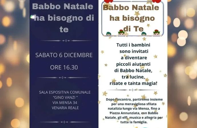 Sabato 6 dicembre dalle 16:45 alle 18:00, presso la sala Espositiva Comunale “Gino Vanzi”, sita in Via Mensa 34, di Venaria Reale, Babbo Natale aspetta tutti i bimbi, per vivere insieme un pomeriggio pieno di magia!